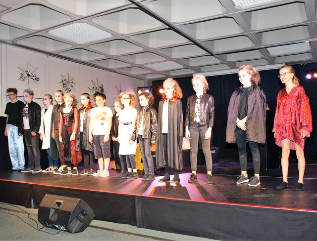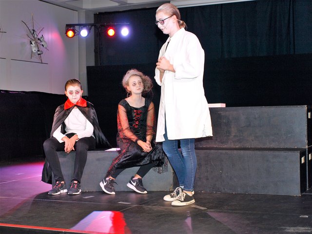 Erwartungsgemäß treten in diesem packenden Musical voller Humor und Spannung verschiedene Mitglieder einer Vampirfamilie auf. Zum 30-köpfigen Ensemble gehören Jungs und Mädchen der Klassen 5 bis 10, die das etwa eineinhalbstündige Musical gleich vier Mal im Foyer der Realschule zum Besten geben – jeweils vor begeistertem Publikum. Die große Besonderheit: Alle 14 diffizilen Rollen sind doppelt besetzt. Neun Songs, darunter der „Blutsong“ und der „Gruftsong“, machen das Vampir-Musical zu einem Top-Erlebnis.