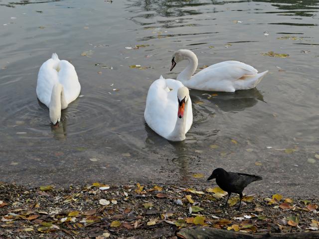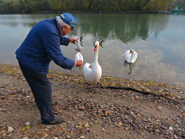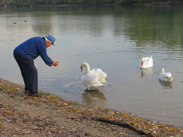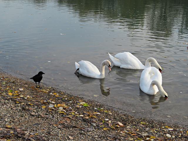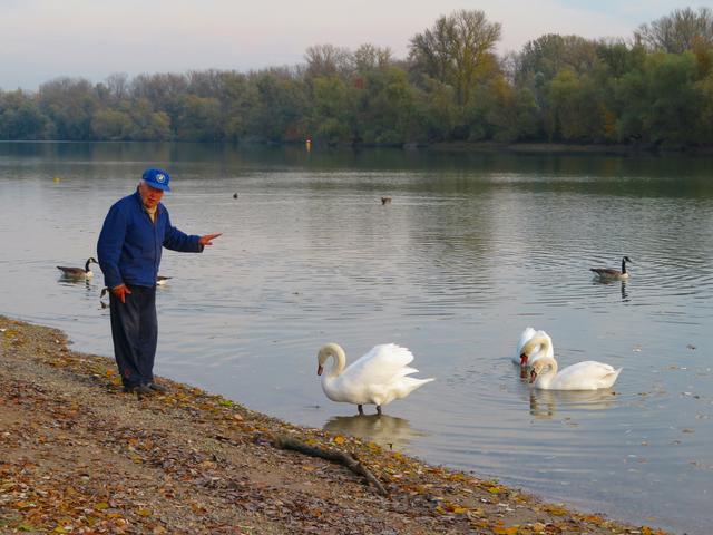 Waldsee. Zufällig traf ich am 15. November am Waldseer Altrhein wieder auf den "Schwanenpapa" Heinz mit Ehefrau Ingrid Diemer, die ihre Schwanenkinder füttern wollten. Momentan sind nur Hansi und Bubi, das 35-jährige Pärchen, mit einem ihrer diesjährigen Jungen da, umringt von den allgegenwärtigen Gänsen und Krähen, die auf einem dicken Ast sitzend wie die Geier darauf warten, etwas von den Leckereien ab zu bekommen. Aber Diemer passt auf, dass seine Schwäne zuerst die Leckerlis bekommen. Ich fragte ihn, wieso das eine Junge denn noch dabei sei, denn er erzählte mir im Frühjahr, dass die drei Jungen das Elternhaus verlassen und sich ihr eigenes Revier suchen müssen. Dies sei das letzte Junge und es sei absehbar am Gebaren der Eltern, dass das Junge sein Hotel Mama schnellstmöglich verlassen müsse.
