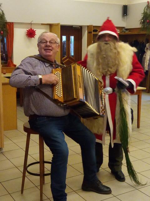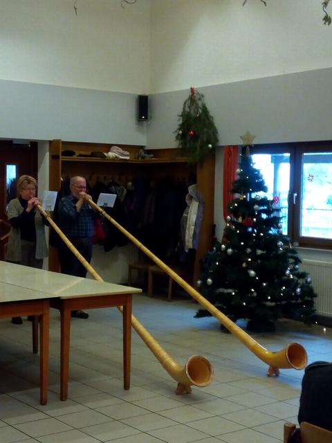 Nach einem Alphornbläserduett des Ehepaares Busch gab es viel Applaus, da ein solcher Vortrag in der Pfalz etwas Besonderes ist und gewissermaßen den St. Nikolaus ankündigen sollte. Dieser verteilte herzhafte Lebkuchen und wurde mit dem Nikolauslied von der Runde und dem Zieharmonikaner Josef Moock begleitet. Es folgten weitere weihnachtliche Weisen zur Freude der begeisterten Sänger.