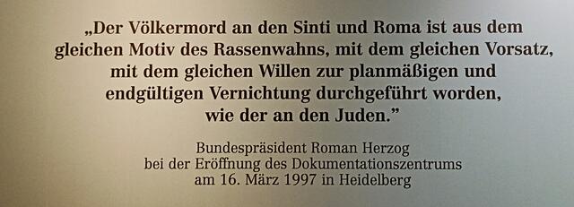 Nach einem Abstecher in den wiedereröffneten Karzer, das frühere Studentengefängnis der Ruprecht-Karls-Universität Heidelberg, ging es für die Oberstufenschülerinnen und –schüler in das Dokumentations- und Kulturzentrum Deutscher Sinti und Roma. Dort führte Joschi Rose, dessen Vater Romani Rosi seit 1982 als Vorsitzender des Zentralrats Deutscher Sinti und Roma fungiert, die Jugendlichen in die Ausstellung ein und beleuchtete deren Hintergründe. In rund 30 Minuten gelang es ihm dabei, einen Bogen von den Anfängen in Indien bis in die heutige Zeit zu spannen und den Völkermord der Nationalsozialisten – rund eine halbe Million Sinti und Roma starben im Holocaust – mit Schicksalen im Familienkreis zu verbinden. An einige der Opfer erinnern in der Ausstellung unter anderem kleine mit persönlichen Gegenständen gefüllte Koffer sowie eine meterlange schwarze Tafel mit über 20 000 Vor- und Nachnamen.