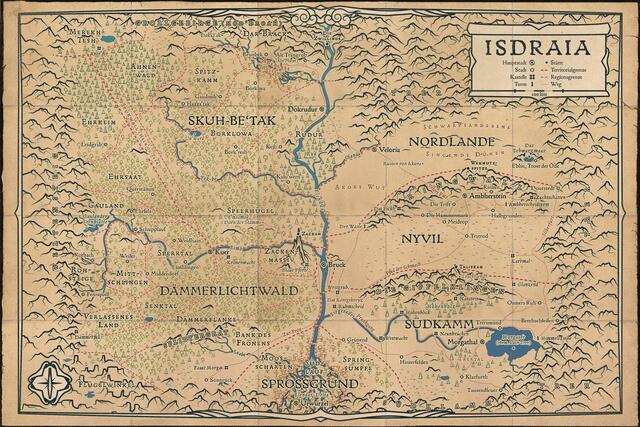 - Die Karte der fiktiven Welt: Burg Nanstein liegt im Gebirge "Die Gipfelklingen", die "Bank des Frönens" (unten links) im fiktiven Gebiet "Zur Frön", angelehnt an die Vordere und Hintere Fröhnstraße in Landstuhl.