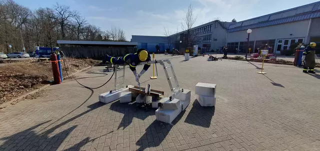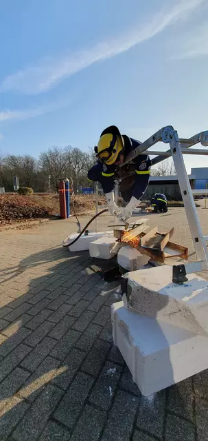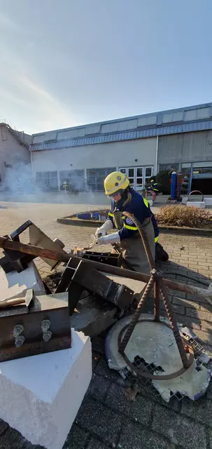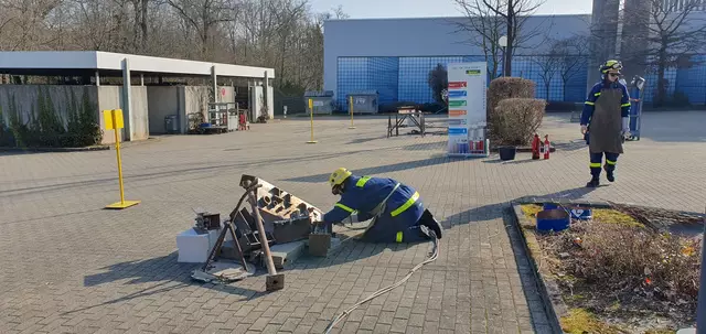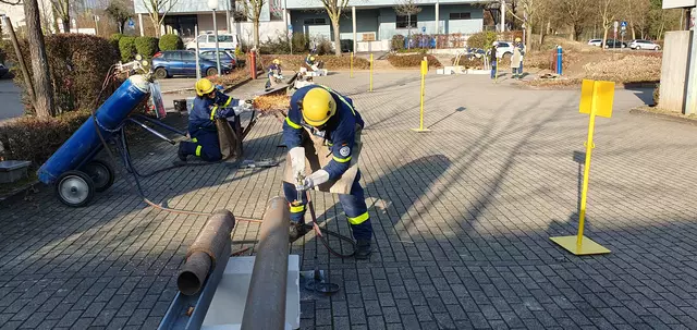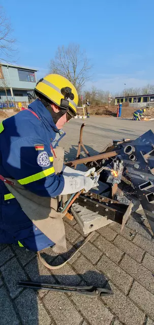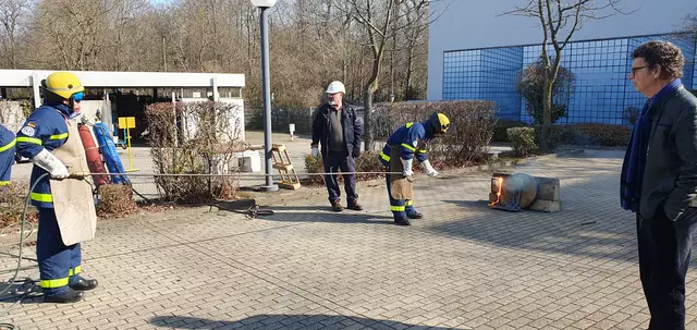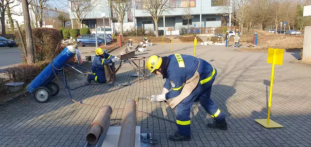 Das THW Ortsverband Heidelberg rückte mit zwei Einsatzfahrzeugen an, und die Helferinnen und Helfer absolvierten die praktischen Übungen in voller THW-Schutzkleidung wie es im richtigen Einsatz nötig wäre. Ihnen standen zehn autogene Brennschneidgeräte sowie eine Sauerstoffkernlanze zum Brennbohren zur Verfügung.