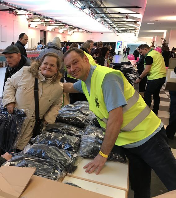Während Frank Zander gemeinsam mit seinem Sohn die Gäste am Eingang herzlich begrüßte, konnte Michael Koch-Erlenwein aus der Südpfalz zusammen mit dem Team der Gewerkschaft der Polizei, Bezirk Bundespolizei, erneut 3000 warme Outdoor Pullover und 1500 Jogginganzüge an die Gäste ausgegeben, die bei der Bundespolizei ausgesondert wurden. Für die Obdachlosen werden diese Pullover und Jogginganzüge bei dem nahenden Winter dringend benötigt und gerne angenommen. Koch-Elenwein ist Vorsitzender der Gewerkschaft Polizei der Kreisgruppe Südliche Weinstraße.